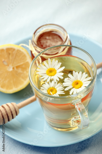 Chamomile flowers and chamomile tea. Chamomile tea in glass teacup with flowers, honey and lemon, top view, prevention of seasona flu colds