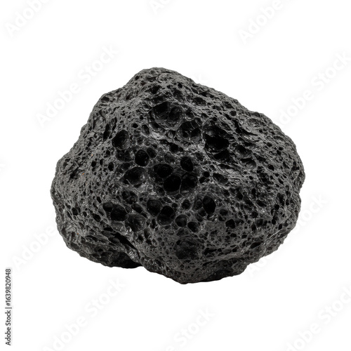 Charcoal-black, porous volcanic rock with jagged, intricate texture, isolated on a pristine transparent plain in a minimalist studio with no shadows, concept of natural raw material