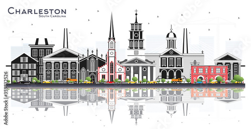 Charleston South Carolina City Skyline with Color Buildings Isolated on White.