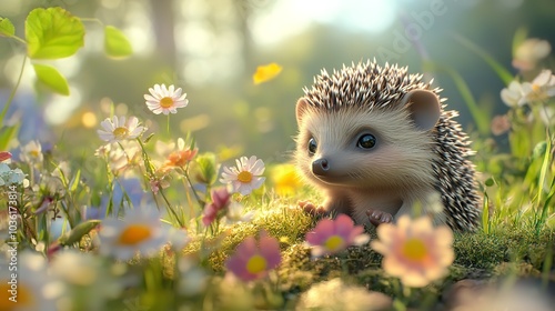 Charming 3D Baby Hedgehog with Pastel Colored Flowers in a Serene Meadow