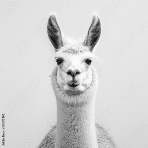 Charming Black and White Portrait of a Llama with Expressive Features Against a Minimalist Background, Perfect for Animal Theme Projects