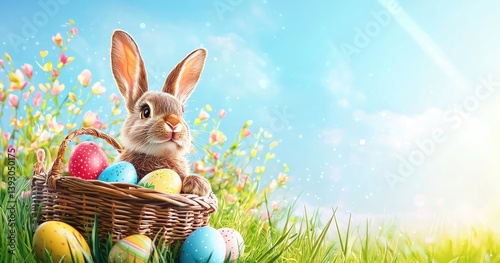 Charming bunny in a basket with colorful Easter eggs surrounded by blooming flowers under a sunny sky. Great for Easter promotions, seasonal cards, and festive banners