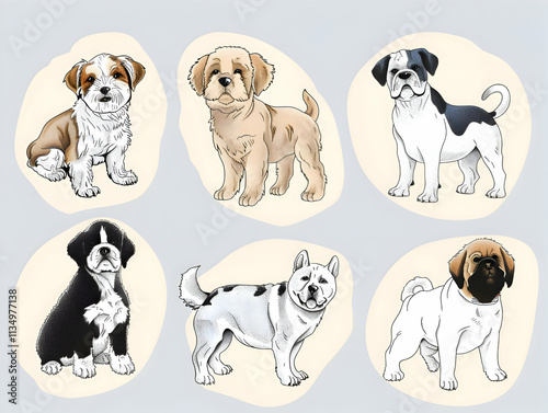 Charming dog breeds illustrated in playful and detailed artwork showcasing their unique personalities and styles.