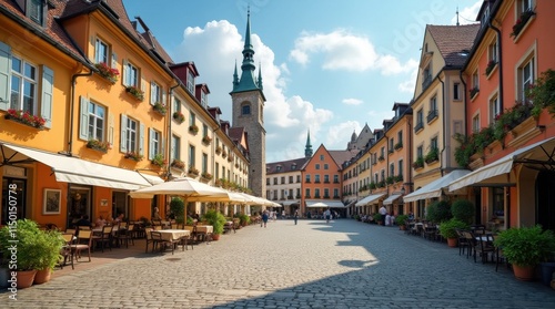 Charming European Town Square with Cobblestone Streets