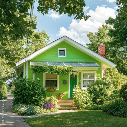 Charming green home with solar panels in bright sunlight emphasizing sustainable living in a lush neighborhood