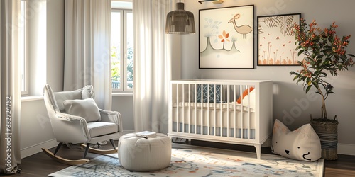 Charming nursery with a crib, rocking chair, and playful wall art