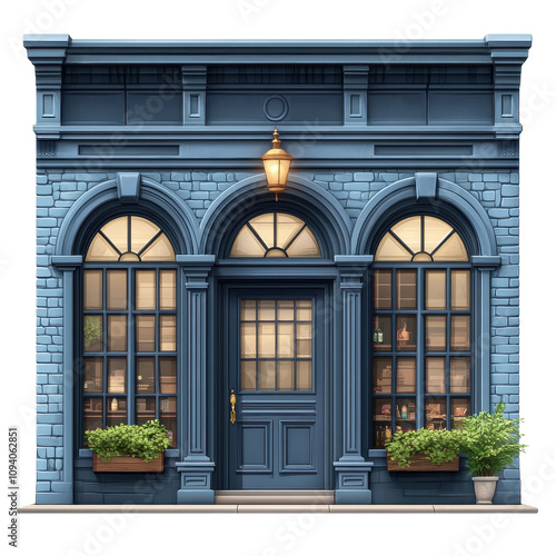 Charming Ornate Brick and Stone Storefront with Arched Windows and Illuminated Entrance