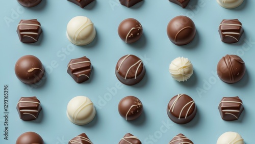 Charming seamless pattern of assorted chocolates on a light blue background, showcasing a delightful flat lay arrangement.
