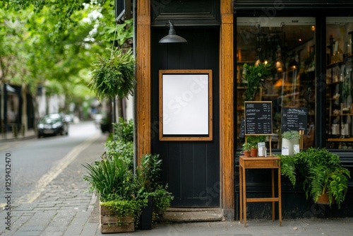 Charming storefront with blank signboard, lush greenery, and inviting atmosphere in a quaint urban setting