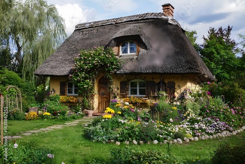 Charming thatched cottage nestled in a vibrant flower garden bathed in soft sunlight creating a picturesque scene