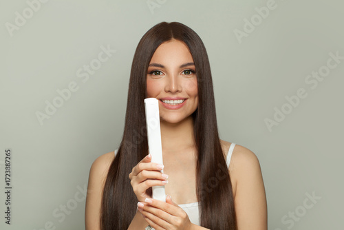 Charming woman brunette with long straight smooth hairstyle using hair straightener iron on light grey background