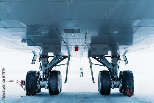 Chassis cargo aircraft Boeing 747. Airport In winter.