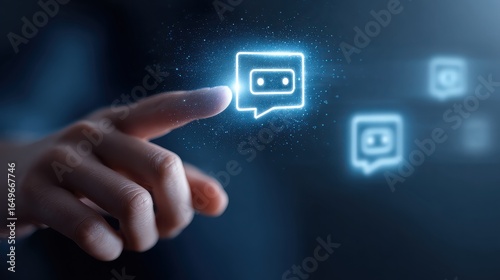 Chatbot Icon Activation with Finger on Glowing Speech Bubble Symbol