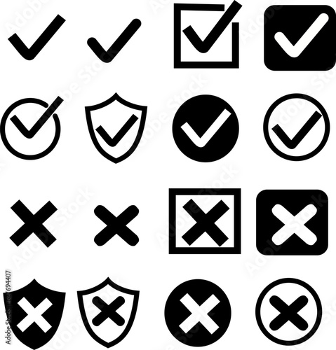 Check mark and cross icon set. Circle and square. Replaceable vector design.