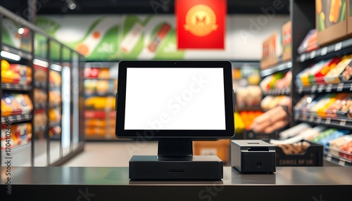Checkout counter with blank screen in a supermarket.