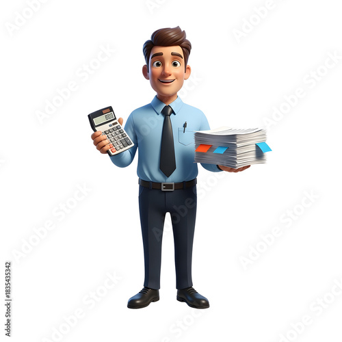 Cheerful accountant holding calculator and large stack of paperwork ready for financial success and analysis