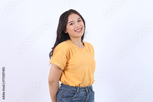 Cheerful Asian woman with confident smile looking at camera wearing yellow t-shirt isolated white background