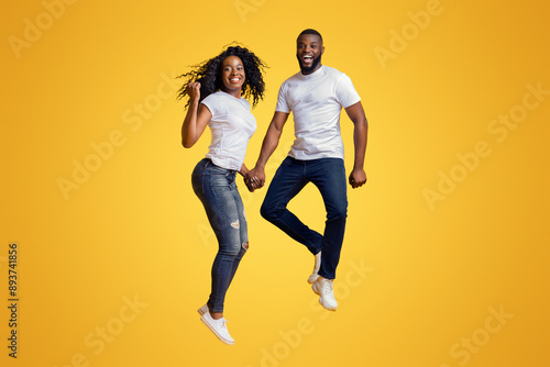 Cheerful Black Man And Woman Are Jumping In The Air, holding hands, copy space