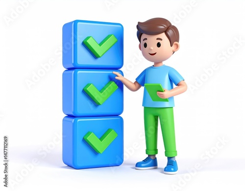Cheerful Cartoon Boy and Completed Checklist: A Playful 3D Illustration