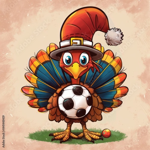 cheerful cartoon turkey wearing a festive hat holding a soccer ball with bright colorful feathers spread, standing on grass with a small ball nearby, playful and fun mood
