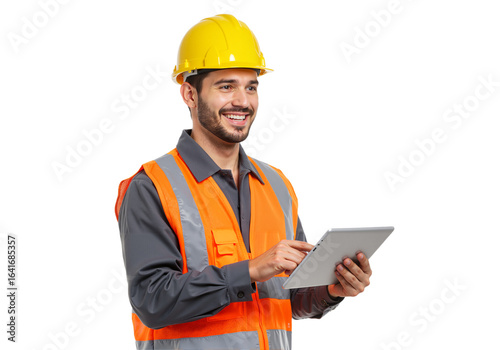 Cheerful construction worker using a tablet for project management and site data analysis.