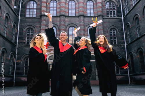 cheerful, contented, students, jumping rejoicing at the end of their studies, holding their hands up with a document.