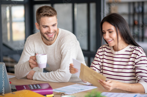 Cheerful couple smiling before reading letter from old friend