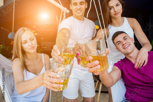 Cheerful friends in the pub. Drinking beer, talking, having fun.