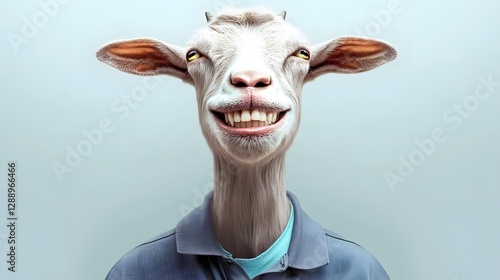 Cheerful Goat with Humanlike Features Smiling in Casual Clothing Against a Light Blue Background