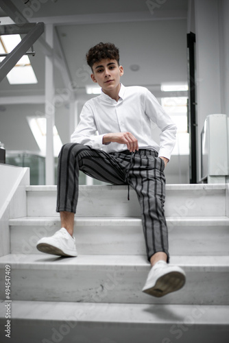 Cheerful handsome stylish young male model poses down on the stairs, looking at camera.