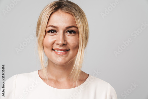 Cheerful happy beautiful young amazing blonde woman posing isolated over grey wall background dressed in basic white t-shirt.