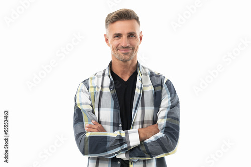 cheerful mature man in studio. mature man wearing checkered shirt.