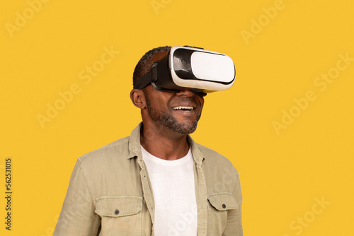 Cheerful middle aged african american man gamer in casual and vr glasses enjoy online game and virtual world