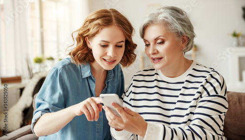 Cheerful mother and daughter using smartphone on sofa.