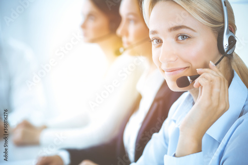 Cheerful smiling business woman with headphones consulting clients. Group of diverse phone operators at work in sunny office.Call center and business people concept