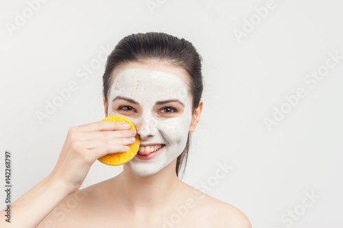 cheerful woman with yellow sponge, white mask