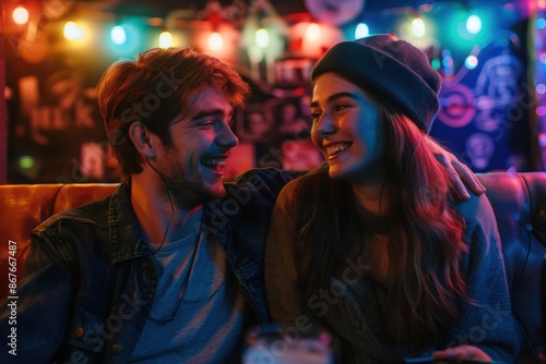Cheerful young couple laughing while conversing on sofa at nightclub