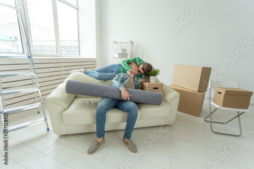 Cheerful young couple rejoices in moving to a new home laying out their belongings in the living room. Concept of housewarming and mortgages for a young family