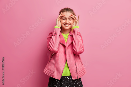 Cheerful young European woman with natural beauty keeps hands on head smiles gently closes eyes dressed in fashionable clothes isolated over pink background. People emotions and feelings concept