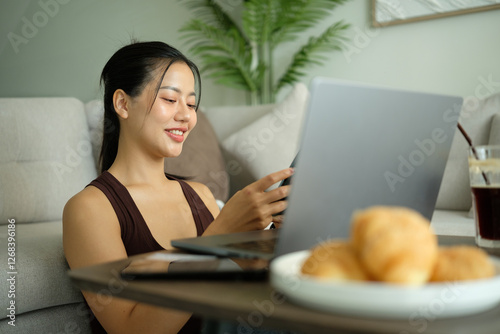 Cheerful young woman leaning against a cozy sofa and using her smartphone.