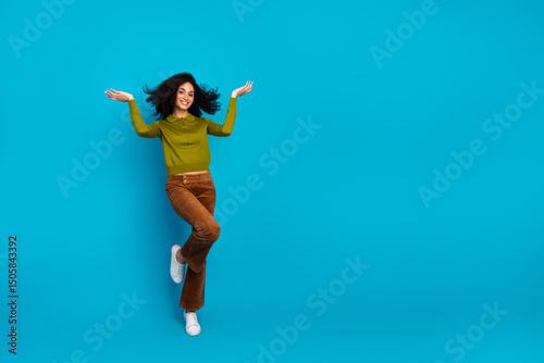 Cheerful young woman posing stylishly against blue background wearing olive shirt and brown trousers