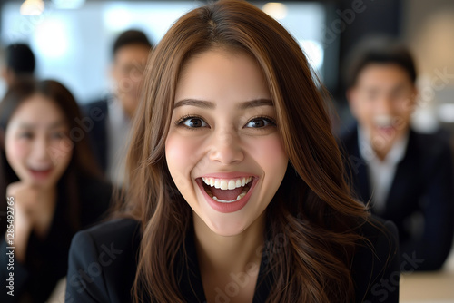 Cheering happy Asian businesswoman with team of colleagues in background, close up in office background