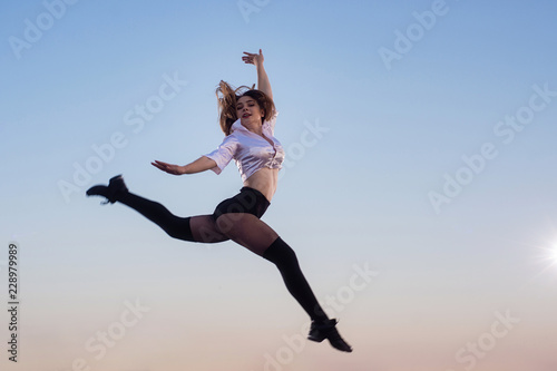 Cheerleader girl with pompoms performs acrobatic element outdoors on the roof
