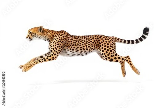 Cheetah in motion: a breathtaking leap across a white backdrop