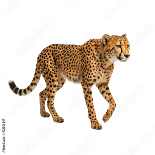 Cheetah walking with spotted fur, isolated on a clean white background, side view