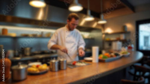 Chef cooking in restaurant kitchen blurred defocused background
