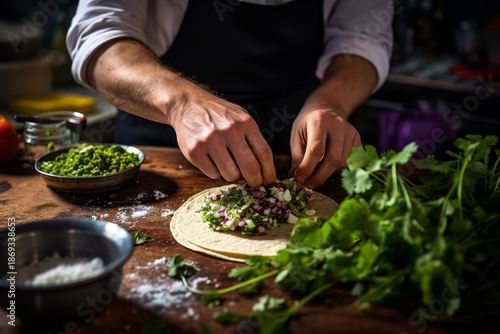 Chef hands filling a tortilla with chopped ingredients on a dark wooden surface
