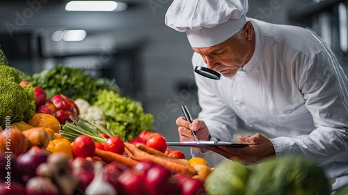 Chef inspecting fresh produce with magnifying glass culinary concept