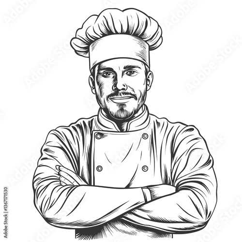 Chef is wearing a white hat and a white apron. He is smiling and looking at the camera