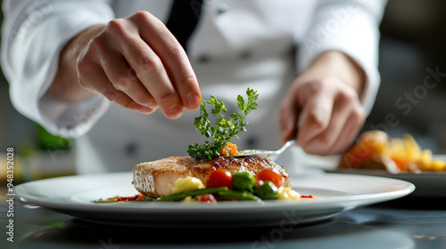 Chef Meticulously Garnishing Gourmet Dish on Plate with Fresh Ingredients for Culinary Presentation